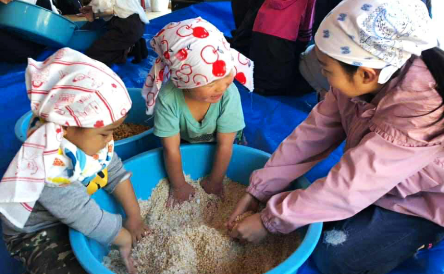 味噌づくりに使う原料の米は、全て自分たちで育てた無農薬の玄米糀と、自家採取を続け各地の在来大豆が混ざった色とりどりの無農薬大豆です。煮豆や玄米糀の甘酒など、味噌作りだけでなく、素材の旨味も実際に味わい、発酵食品が作られる原料についても学びを深めます。